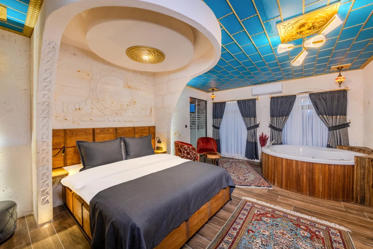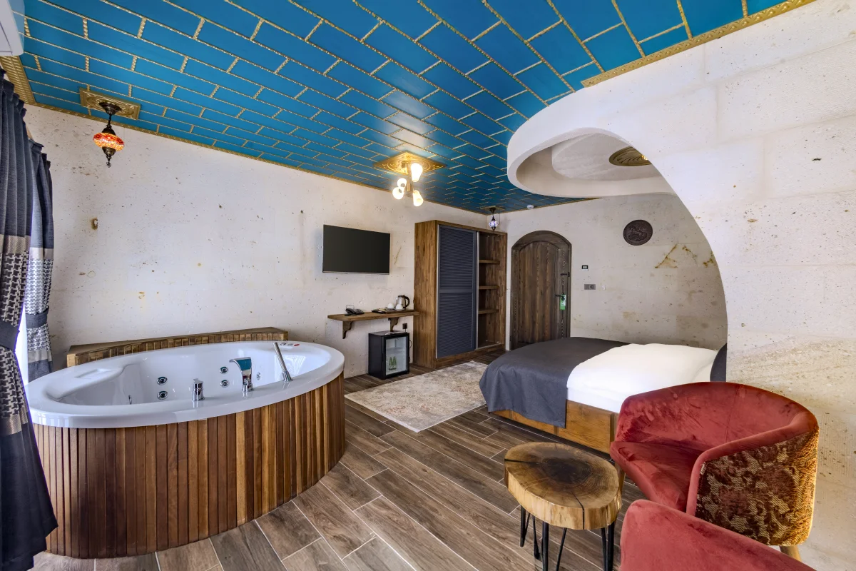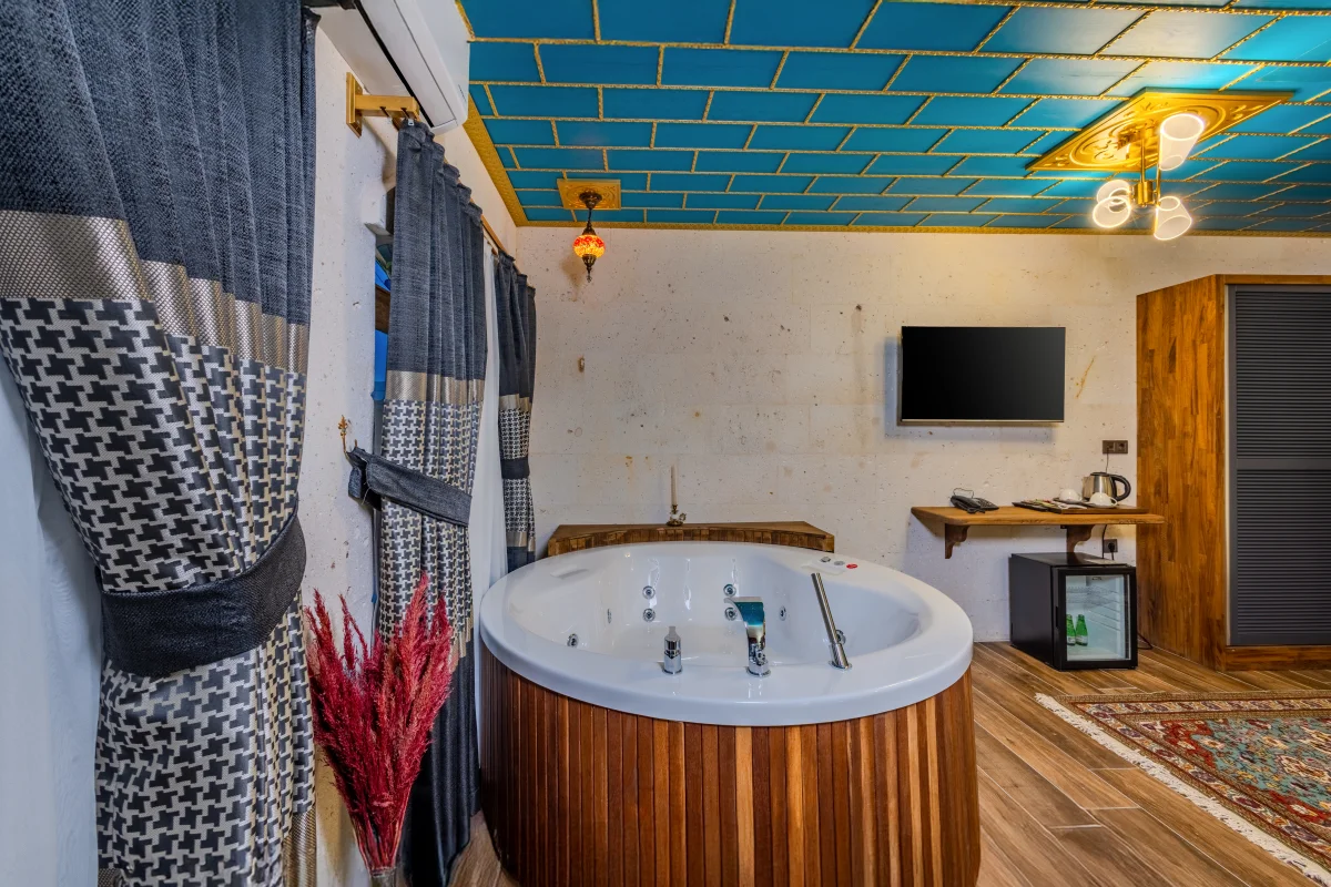 Özel spa küveti ve şömine ile romantik atmosfer. Rahatlama ve konfor bir arada.